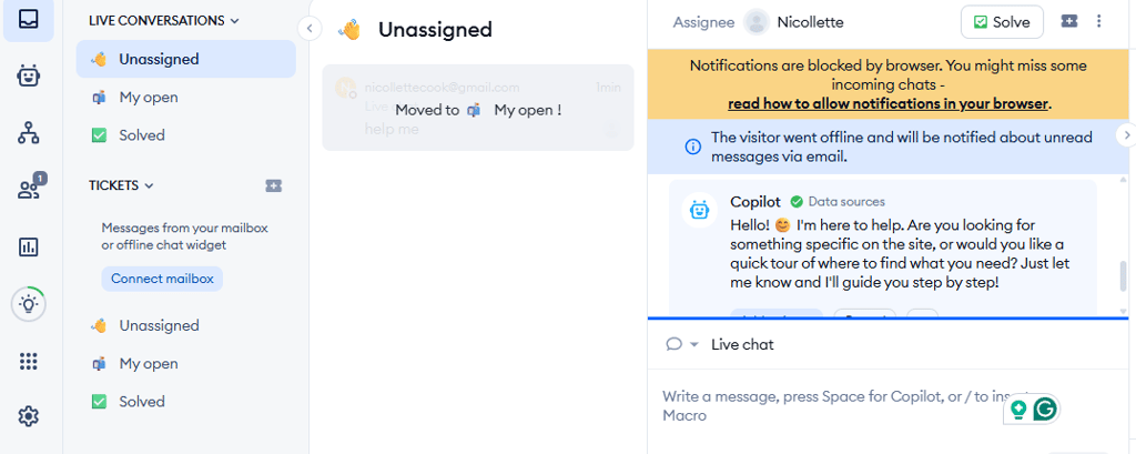 Tidio includes a chat simulator so you can test conversations before making your website public. This made learning the tool much less stressful. Conversations automatically show up in a queue, and you can either let the AI answer or jump in as a human when needed.
