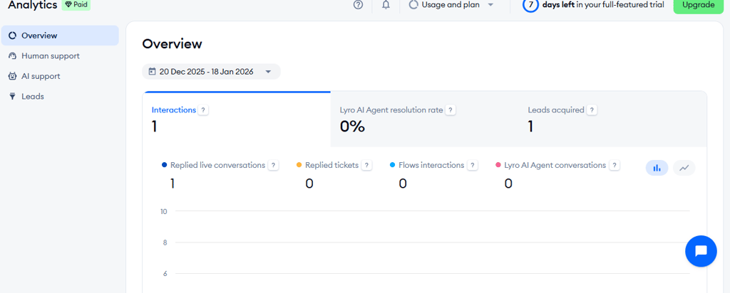 The analytics tab shows how many conversations the AI resolved, how many required human help, and how many tasks were completed overall.