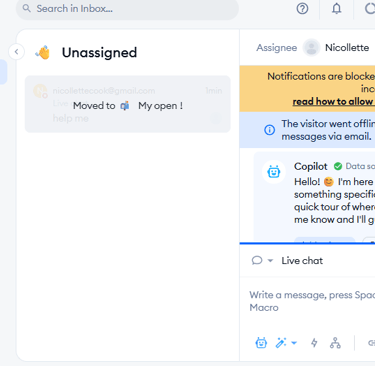 Customer details—like location, email, and recent page views—show up on the operator side, which helps give context without digging.